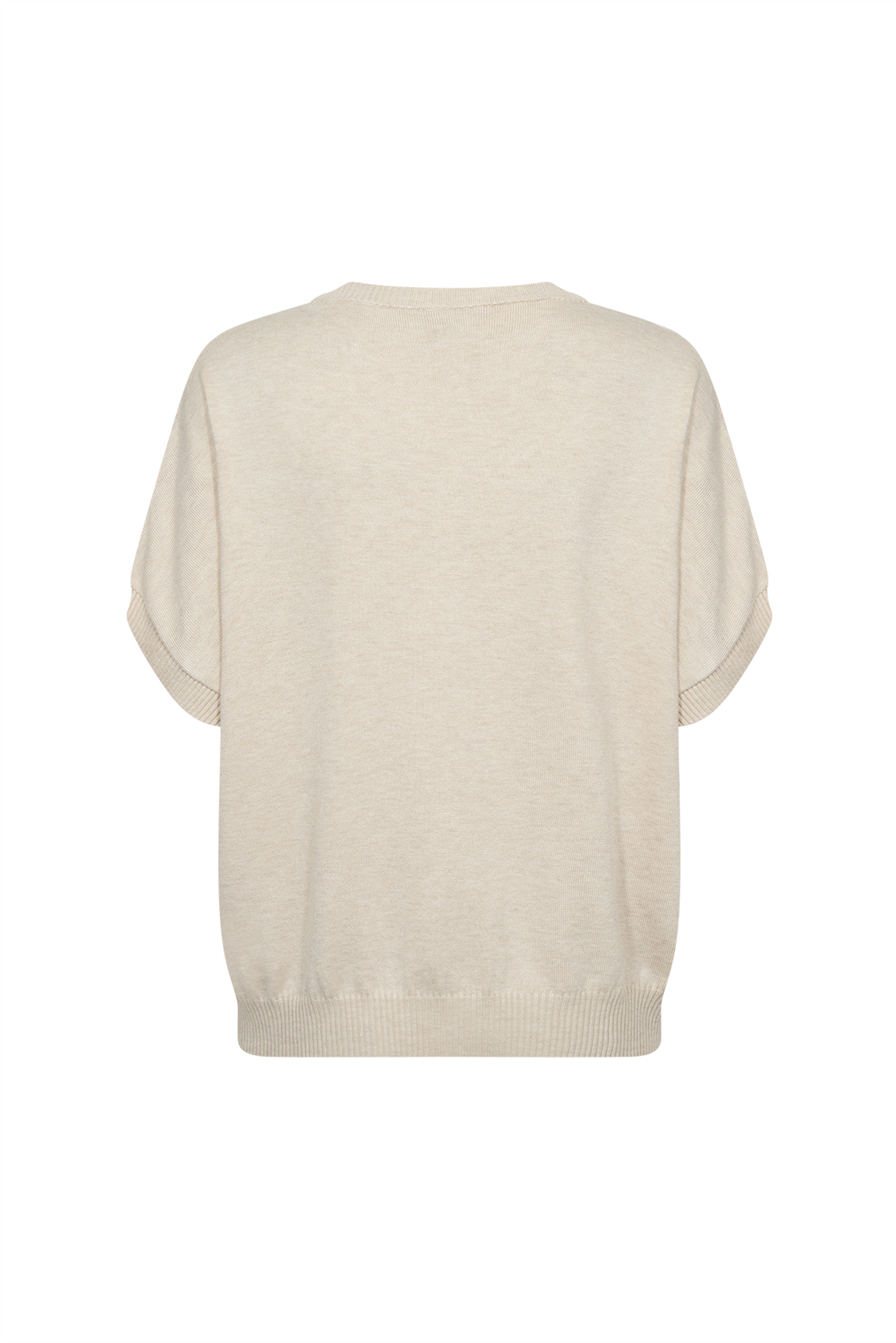 • Er hat einen klassischen Rundhalskragen, kurze Ärmel und einen gerippten Saum, der die entspannte Silhouette unterstreicht