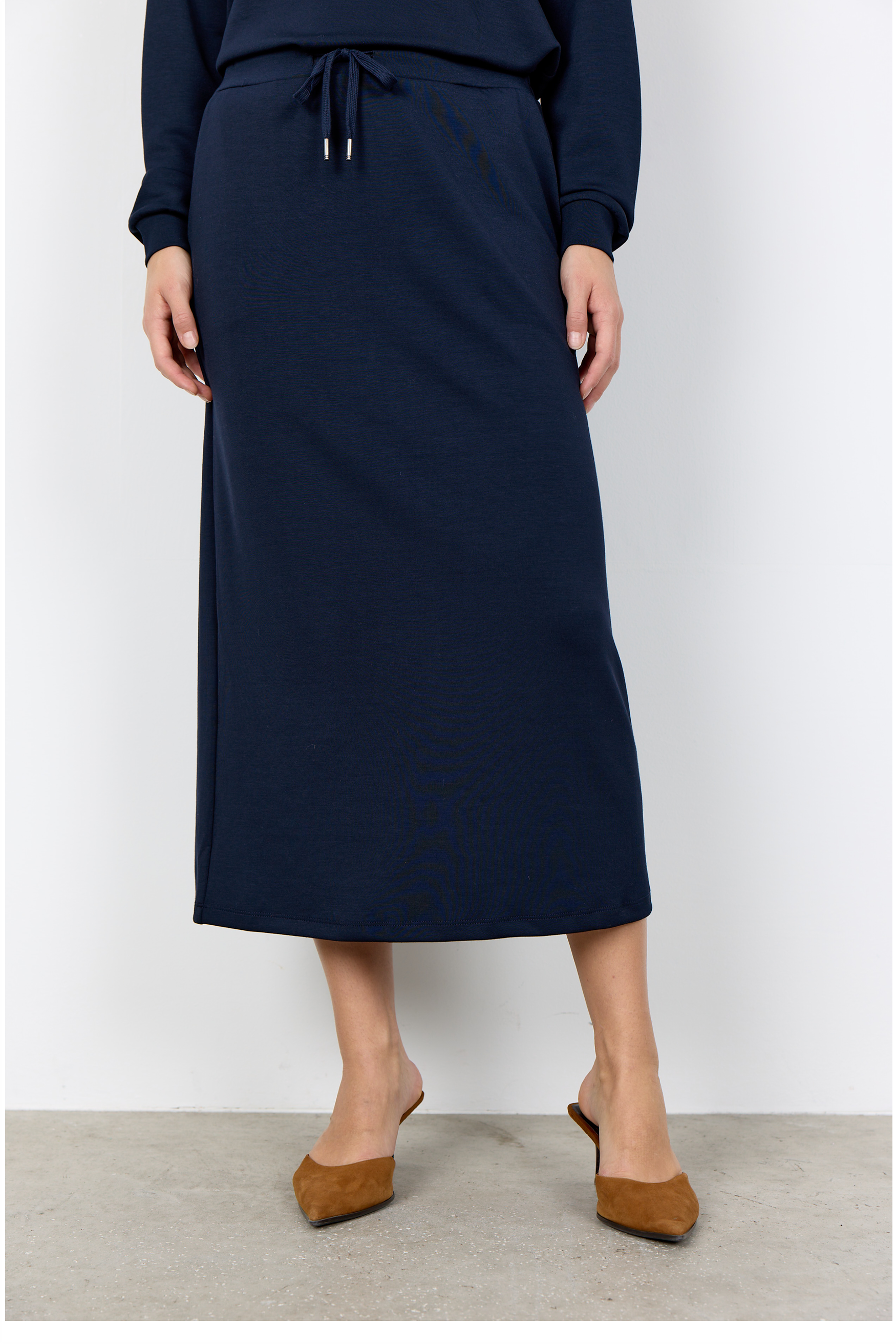 • Dieser elegante Rock hat einen geraden Schnitt mit einem Kordelzug für eine verstellbare Passform